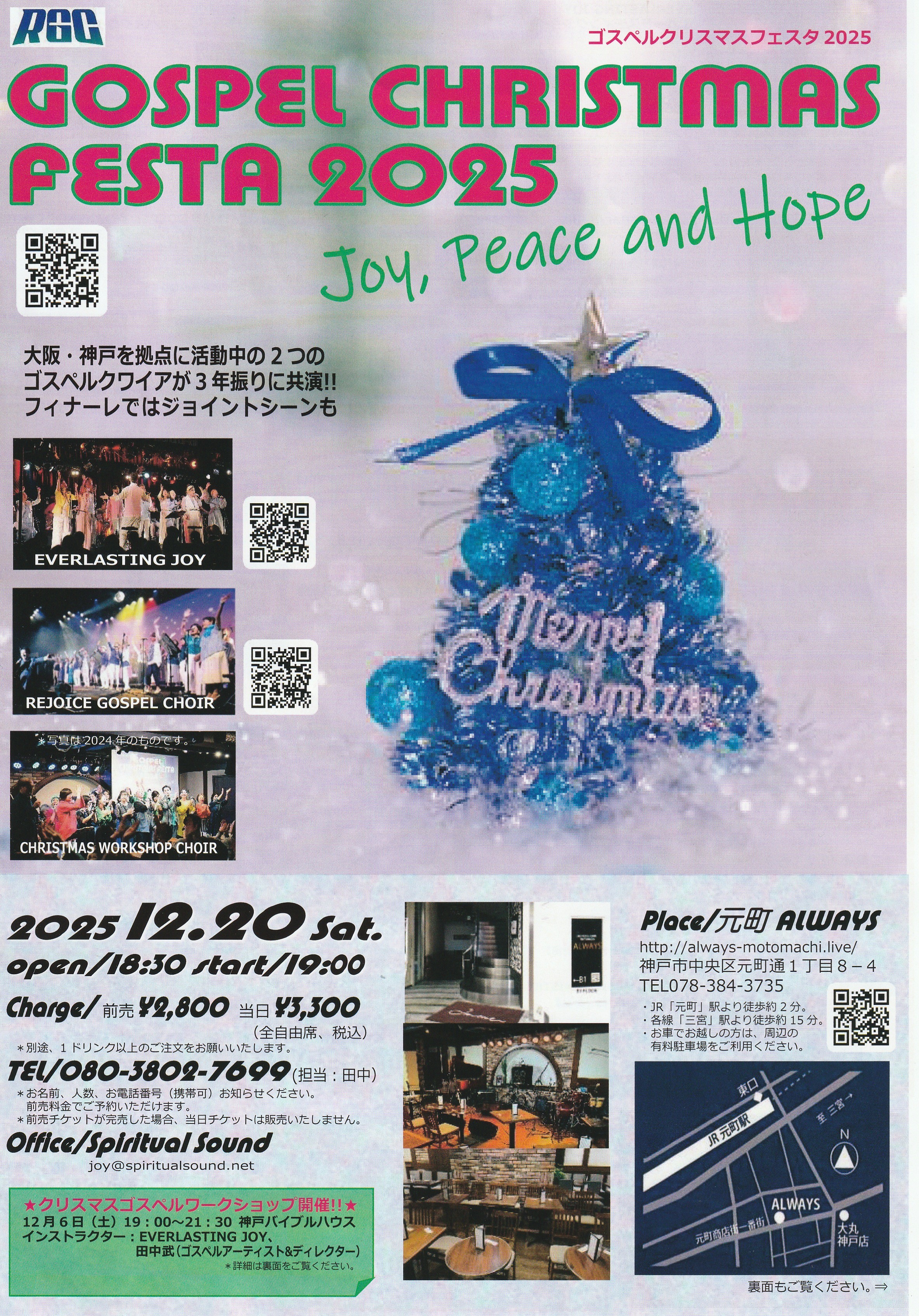 ■CHRISTMAS SPECIAL WORKSHOP 2019 日時:2019年12月7日(土)19:00-21:30 会場:神戸バイブルハウス 神戸市中央区磯上通4-1-12 ハイパーホテル1・2・3 2階 TEL078-252-1966 インストラクター:EVERLASTING JOY 、ゴスペルアーティスト 田中武 参加費:一般4,000円 学生3,000円 主催・企画:Spiritual Sound 連絡先:080-3802-7699 joy@spiritualsound.net (担当:田中) | ![]() |